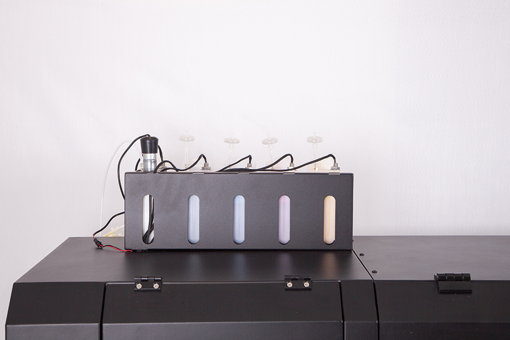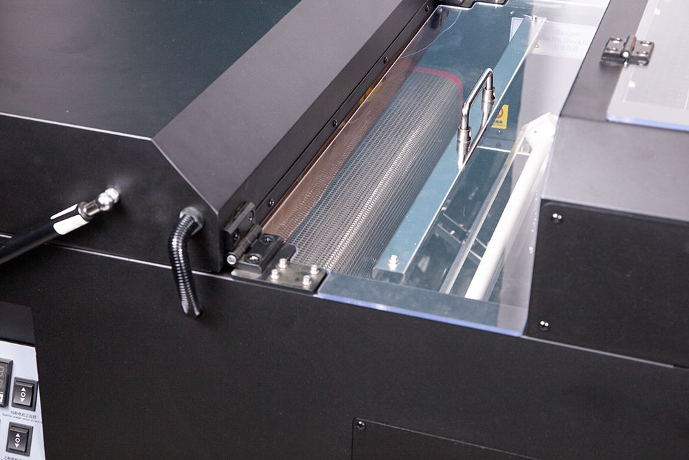 Pet film üzerine 2 kafa yada 4 kafa ile pigment baskının ardından, transfer tozu baskı üzerine uygulanır ve statik elektrinlenme engellenir. Fırın ünitesinden sonra kurutma bölümüne geçen baskı daha sonra rulo halinde sarılarak el değmeden transfer baskıya hazır hale gelir. Duman tahliye modülü sayesinde çalışma sırasında oluşabilecek koku ve duman dışarı tahliye edilir.